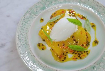 Dela Flamberad ananas med passionsfrukt och yoghurtsorbet Kombinationen varmt och kallt är magisk, ytterligare en dimension får upplevelsen när man lägger till chilihetta...Läs mer Till Receptet Glass 232
